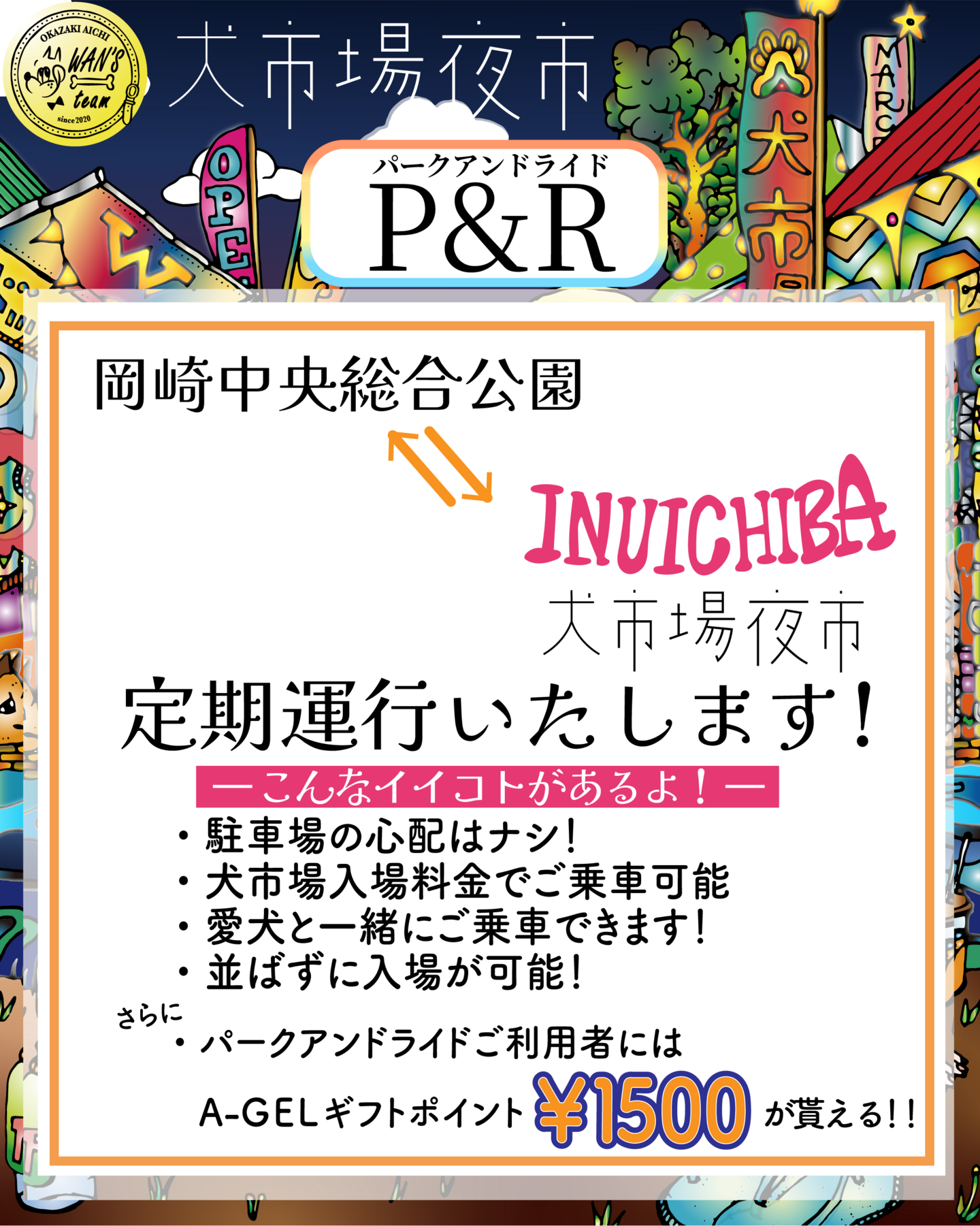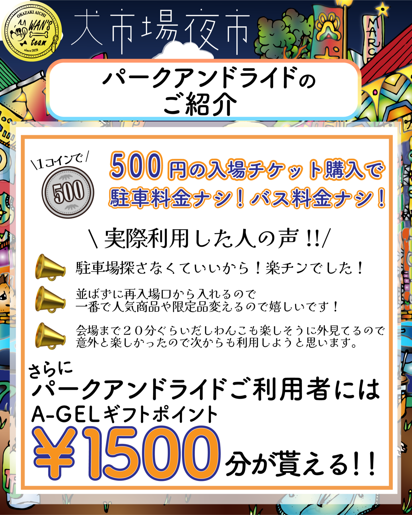 そして今回、パークアンドライドご利用者にはA-GELギフトポイント合計1500(※)ポイントをプレゼントいたします!是非とも犬市場でA-GELギフトポイント使ってみてくださいね!(※来場者特典1000ポイント+パークアンドライド利用で追加500ポイント)